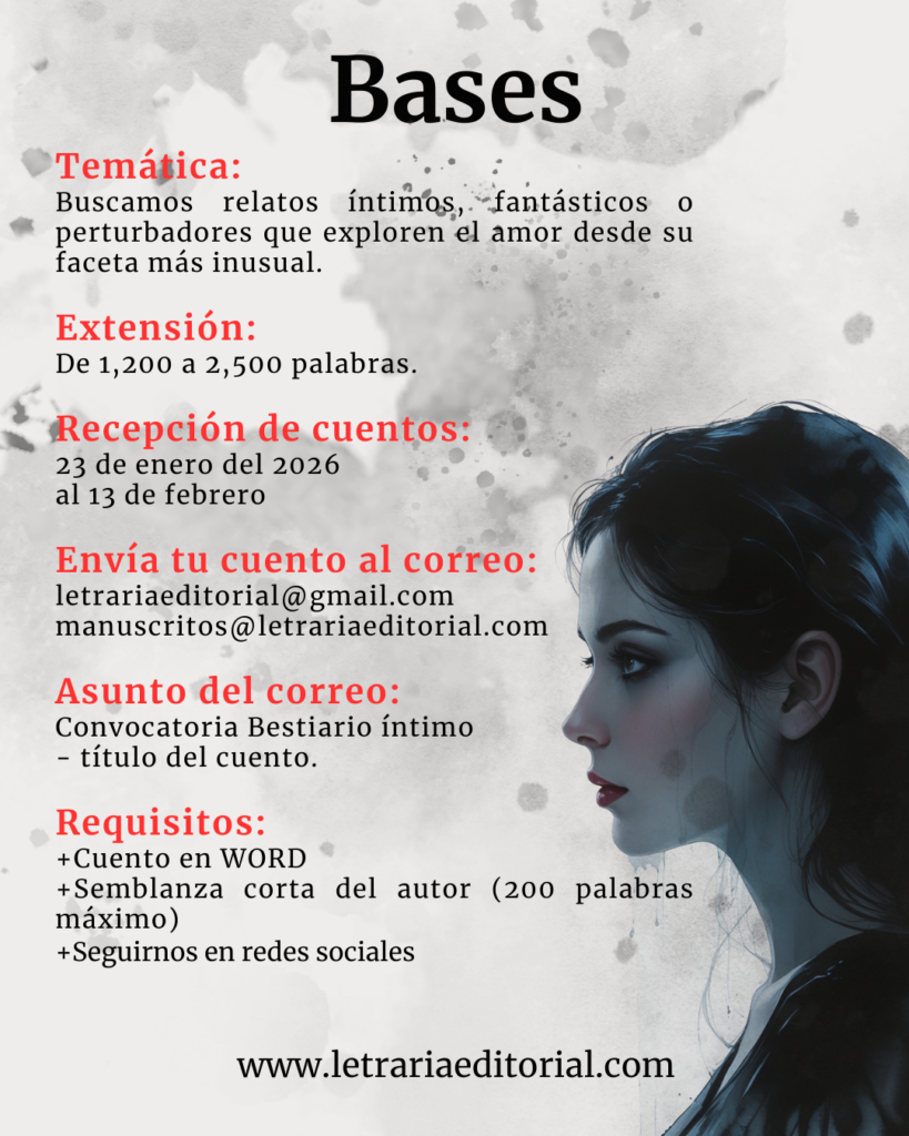 El amor adopta formas inesperadas. A veces nace en la luz, a veces en rincones oscuros… y en ocasiones, en lo monstruoso. “Bestiario íntimo” es una convocatoria para relatos donde lo extraño, lo temible o lo inusual se convierte en el centro de una historia romántica o emocional.