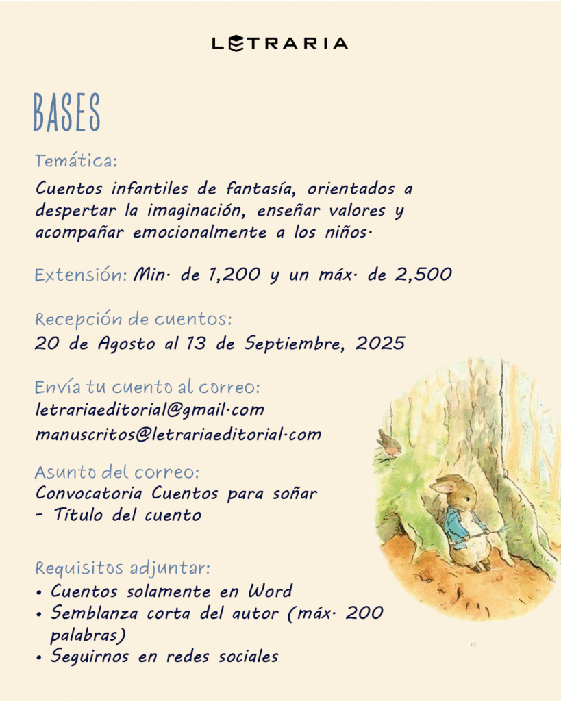 Letraria Editorial convoca a todas las escritoras y escritores, cuentistas y narradores, a participar en el libro de cuentos infantiles para publicación física y digital (ebook) bajo la temática: