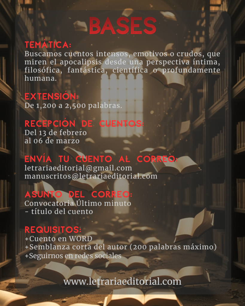 Hay muchas formas de que el mundo termine. Un cataclismo, una profecía incumplida, un error humano, un silencio que crece o algo completamente inesperado. En “El último minuto” invitamos a escribir cuentos que narren no solo cómo acaba todo, sino quiénes somos cuando sabemos que lo inevitable está por ocurrir.